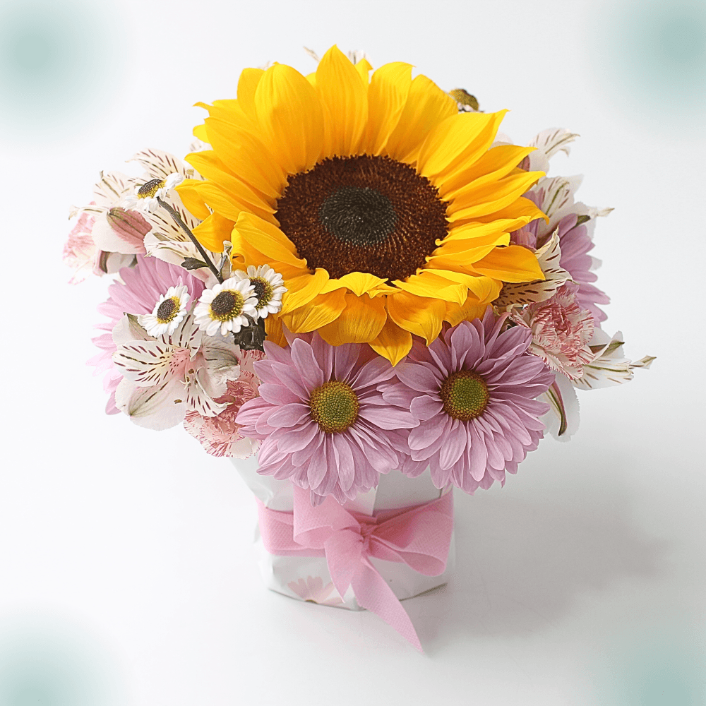 Un encantador arreglo floral compacto diseñado para evocar alegría y optimismo. Presenta un majestuoso Girasol como protagonista, rodeado de delicadas Margaritas Rosas y complementos en un elegante box con lazo. Ideal para regalar sonrisas en cualquier ocasión.