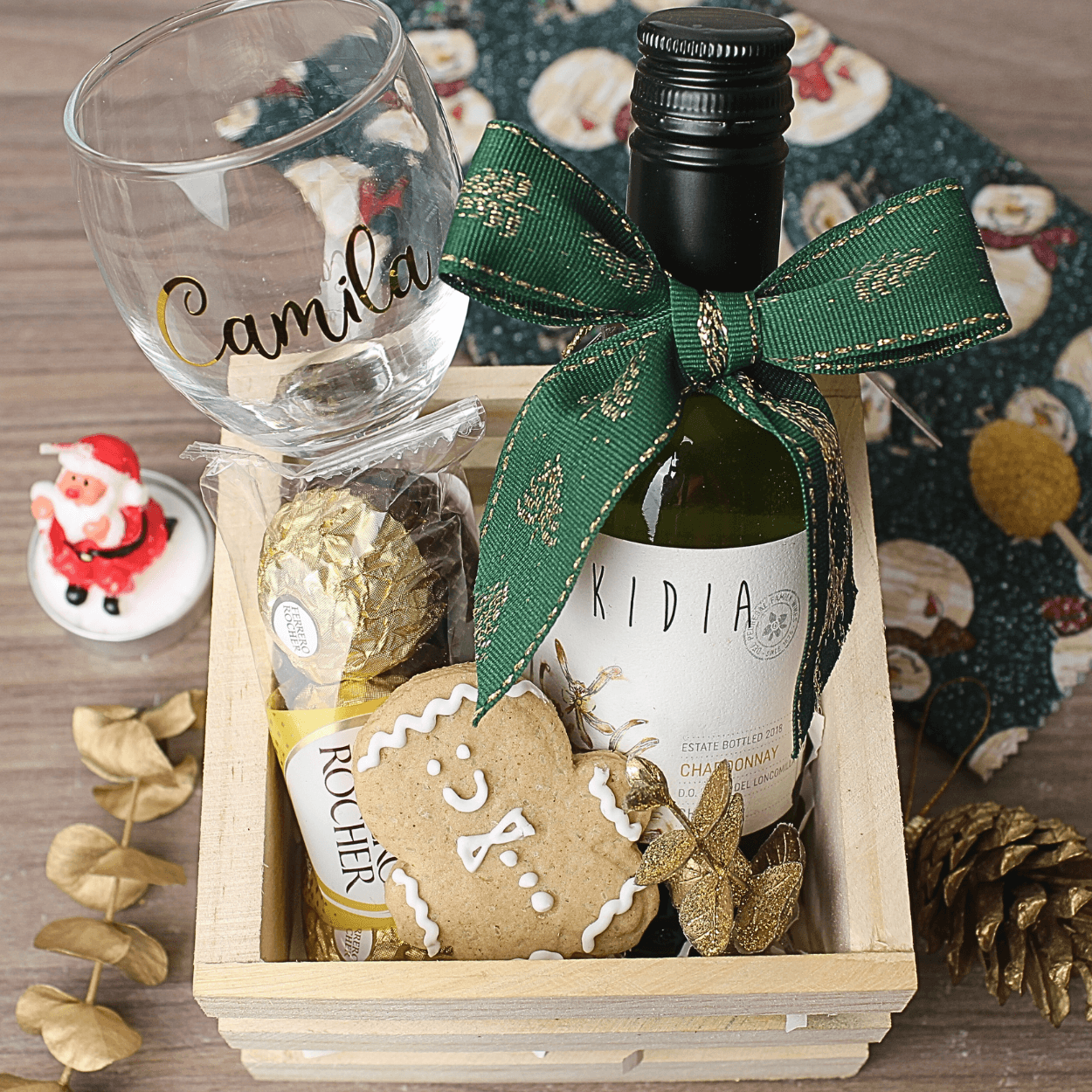 El regalo ideal y personalizado para brindar. Incluye una botella de vino blanco (Chardonnay Kidia), bombones Ferrero Rocher, una galleta de jengibre y una copa de vino con nombre personalizado en vinil. ¡Un detalle que combina elegancia, sabor y exclusividad!