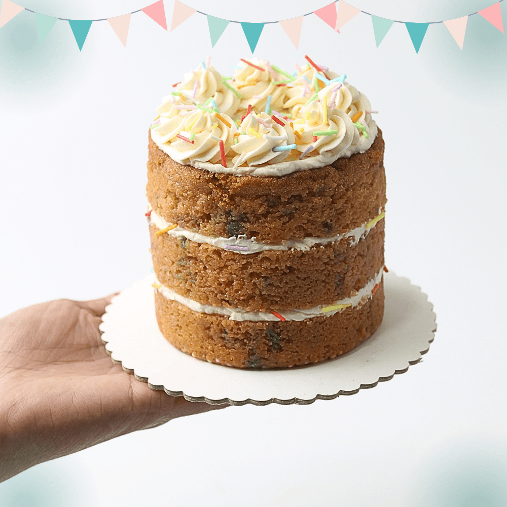 Intercalamos una generosa cantidad de nuestra inigualable buttercream de vainilla. El diseño naked cake expone las divertidas capas de bizcocho salpicado, y la torta se corona con un topping de rosetones de buttercream y, por supuesto, una lluvia adicional de chispas de arcoíris.